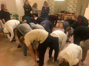Så här ser det ut när 25 unga ledare leker ”Kvack kvack”! Det är alltid roligt att hålla lekkurs i Sollentuna – nu har vi varit där så många år att en av dem som var med under de första åren hunnit bli anställd!